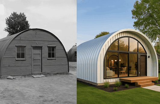 More than 150,000 Quonset Huts were built between 1941 and 1945. After the war, they became a cornerstone of American life — transformed into homes, workshops, and warehouses.